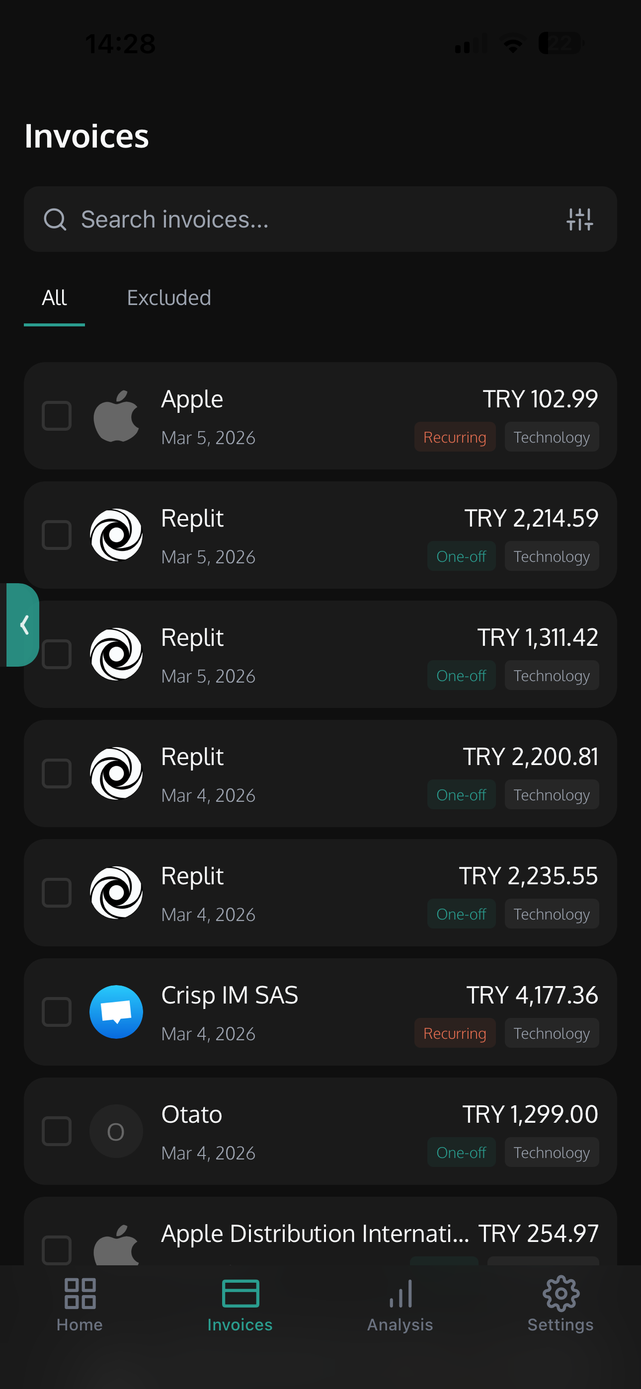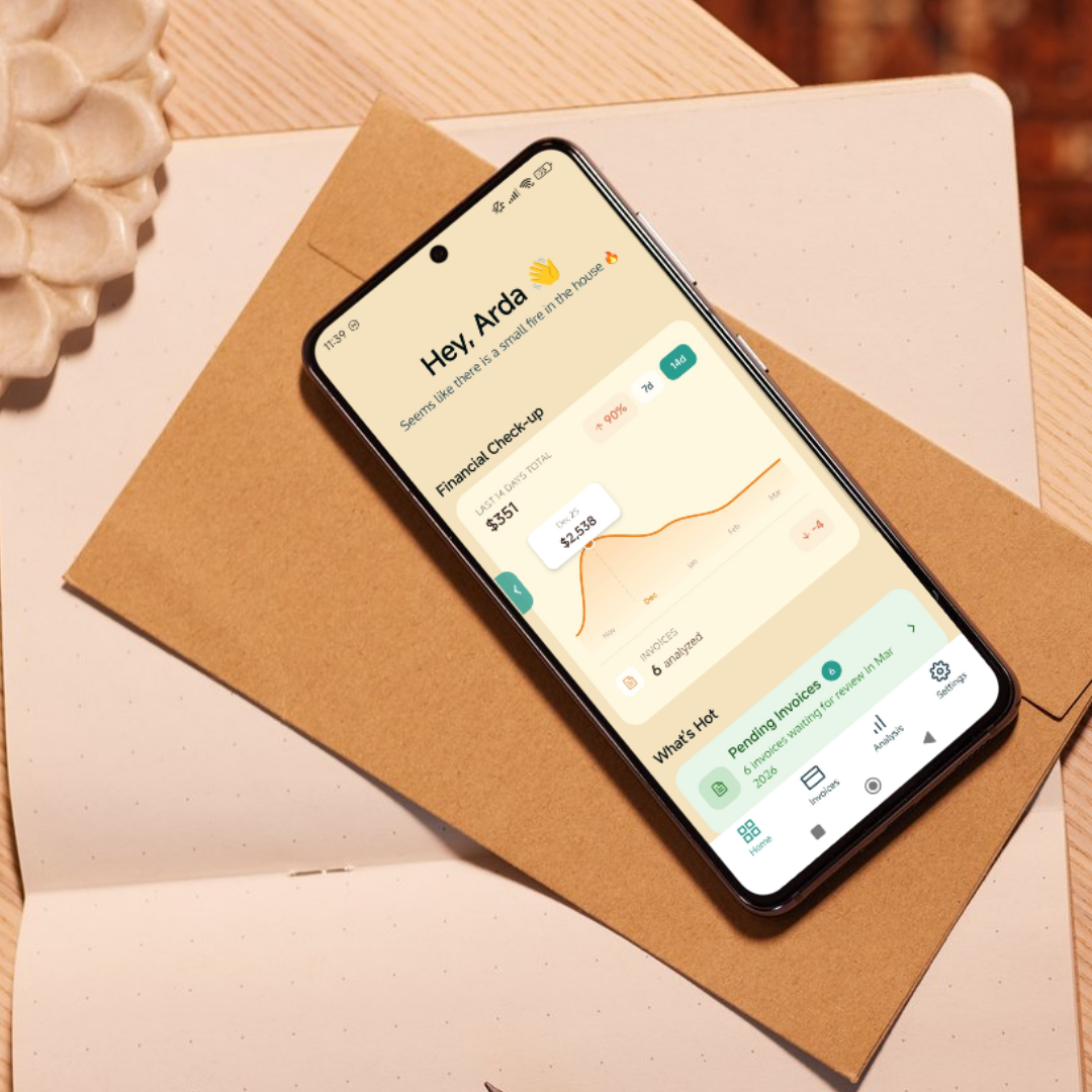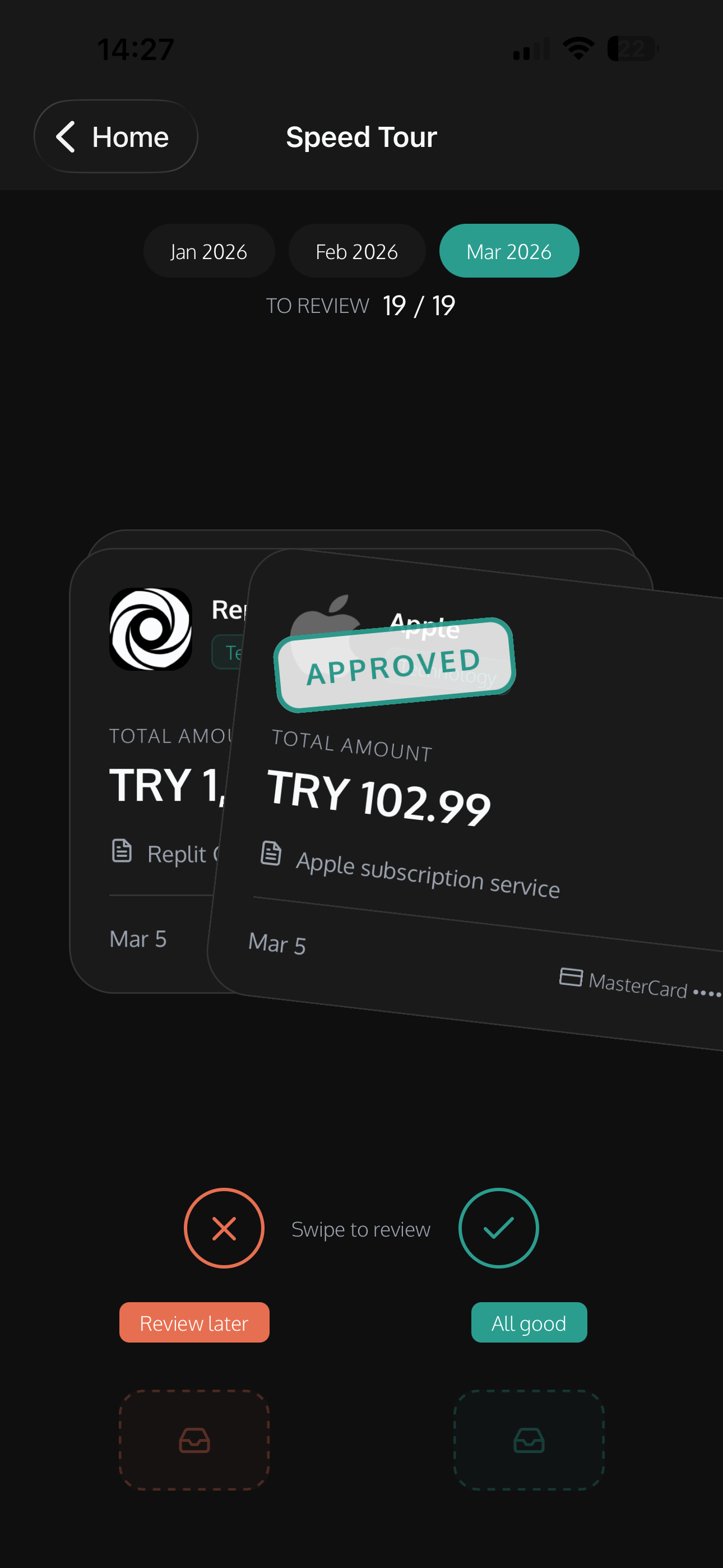Swipe through invoices to approve or flag them. Review your entire month in under a minute.