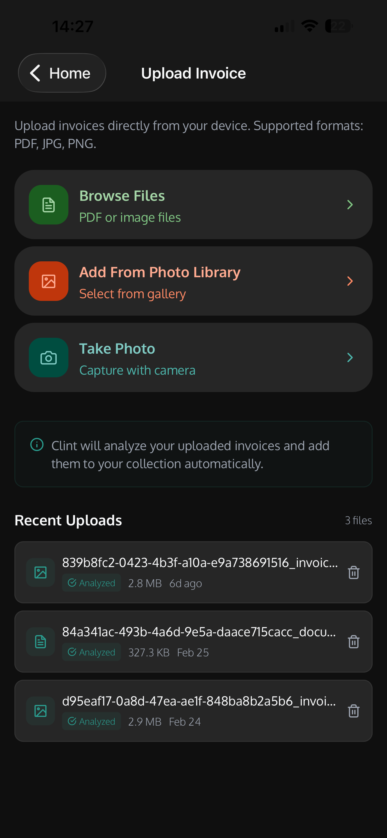 Absolutely. You can browse files, pick from your photo library, or snap a photo of a paper invoice with your camera. Clint will analyze it automatically and add it to your collection.