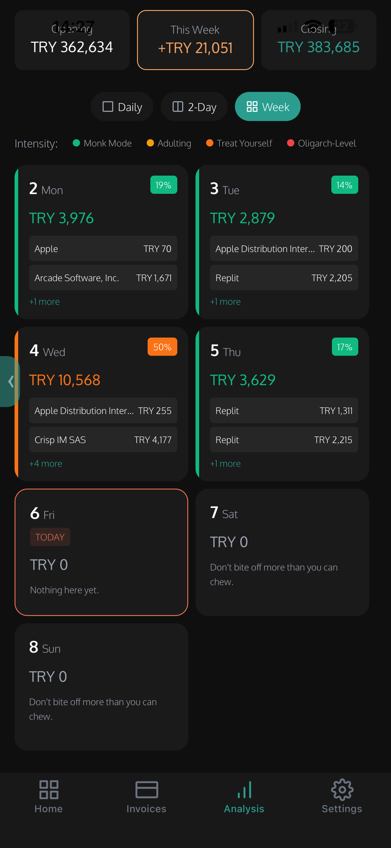 See your spending intensity day by day. Know exactly what left your account and when.