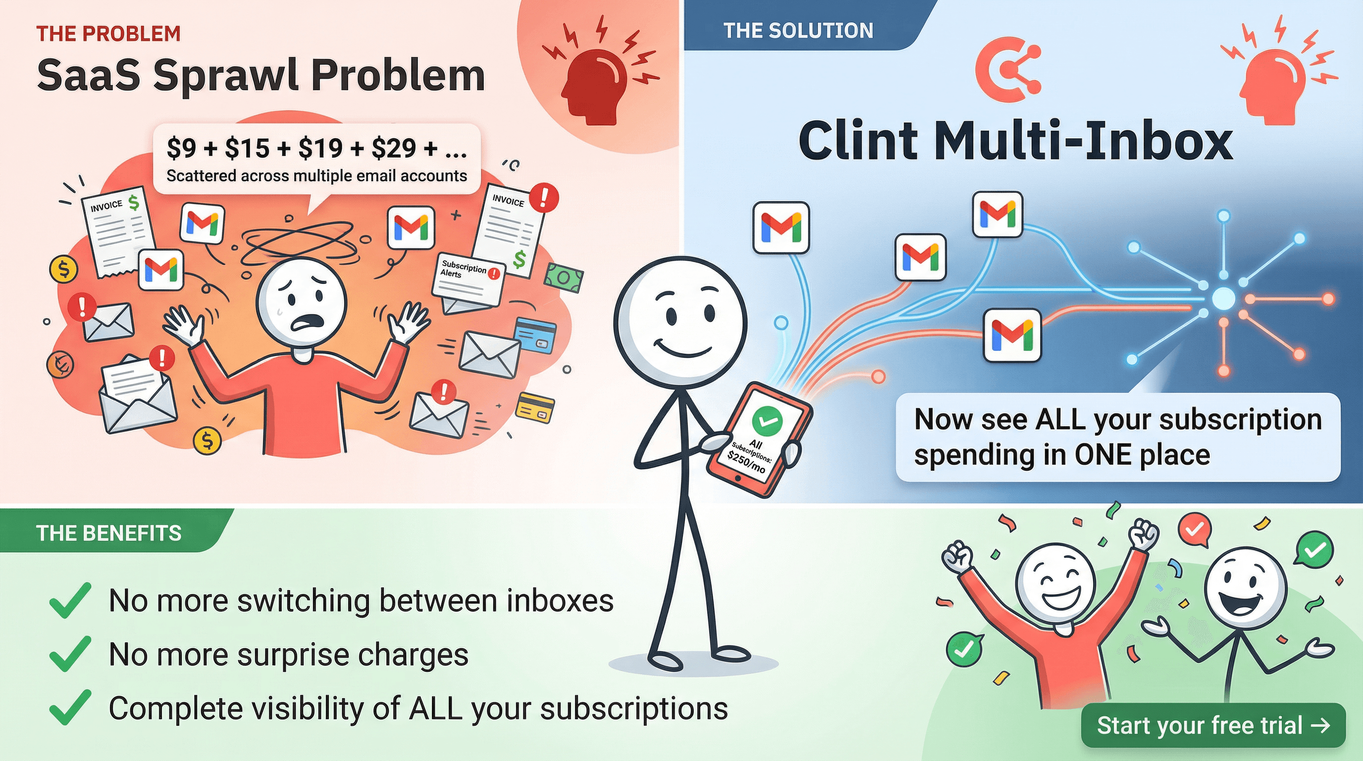 Clint's Multi-Inbox feature gives you the visibility you need to make smart decisions about your subscriptions. Connect your Gmail accounts, see everything in one place, and start saving money on tools you're not using.