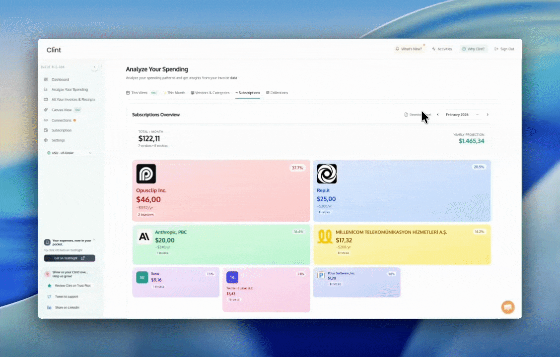 Smart Subscriptions automatically detects recurring charges in your invoices. It tracks renewals, alerts you to price changes, and sends reminders before upcoming charges so you're never caught off guard.