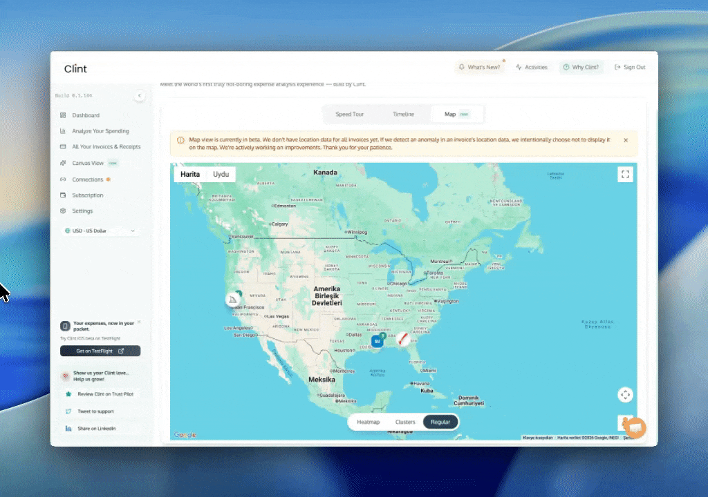Canvas Views are immersive, swipe-based interfaces that let you explore your finances visually. Speed Tour gives you a quick overview, Timeline shows spending over time, and Map displays where your money is going geographically.